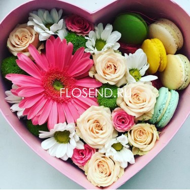 Розы кустовые Бомбастик и Фаленопсис, макаронс в коробке сердце