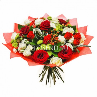Букет из красных роз и хризантем